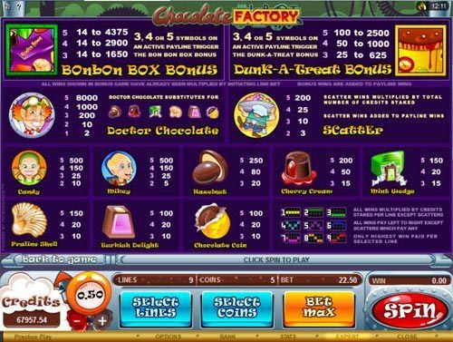 Enter Chocolate Factory Slot Machine and find yourself in the holy of sweets cooking. But these candies are not so simple, what’s more, they are very lucrative. And it looks like your balance is hungry for money goodies. Don’t make it wait for long and feed your wallet with awards immediately.